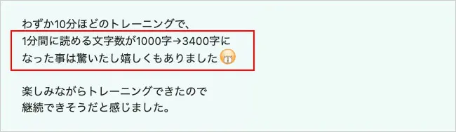 Active Readの講座内容は速読トレーニングだけではなく、視野拡大・脳機能活性・目標設定の方法など、人生に役立つスキルが散りばめられており、日常生活のあらゆるシーンでその効果を体感しています。